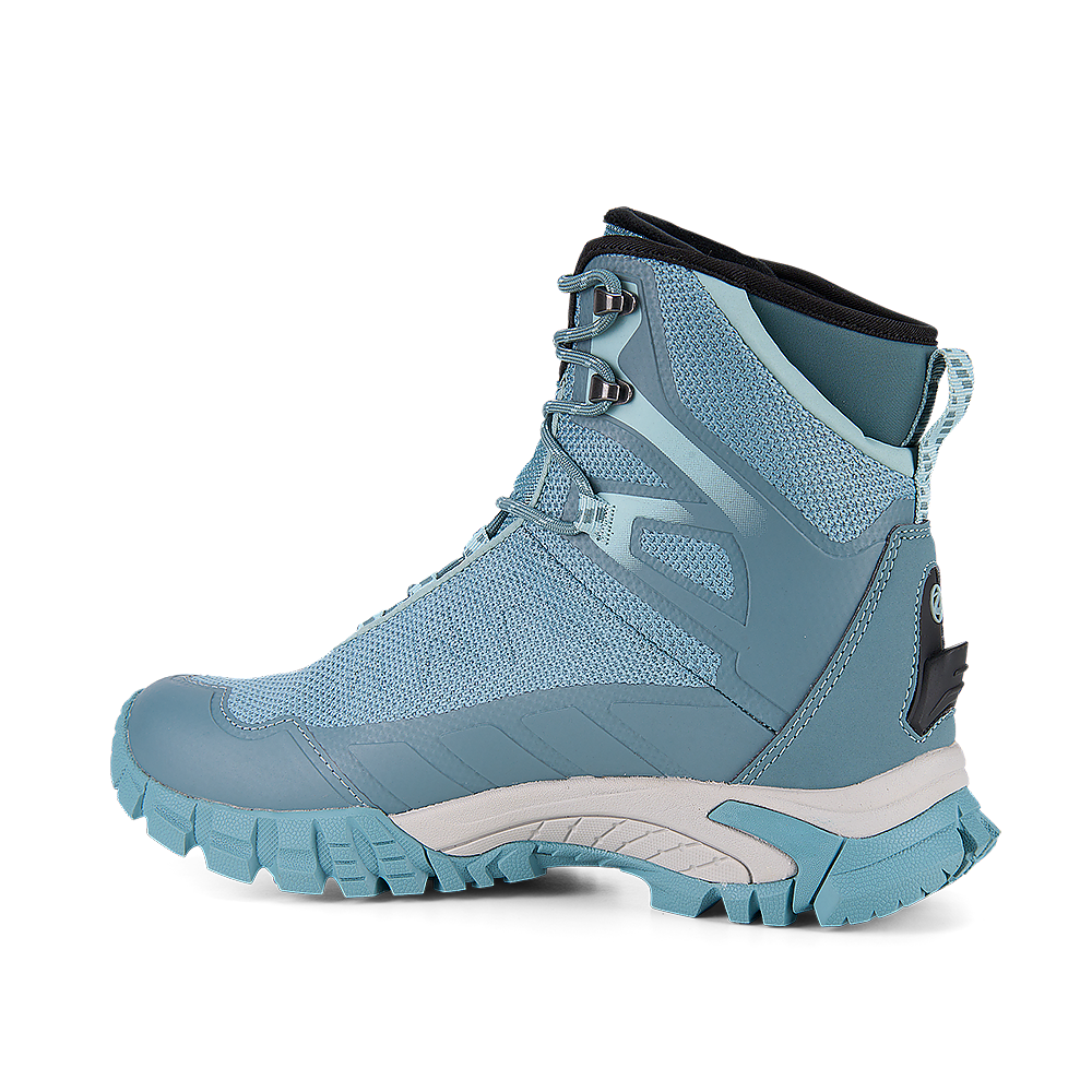 Questo doposci tecnico, al contempo leggero e robusto, offre prestazioni eccellenti durante le attività invernali più impegnative e in tempi prolungati, come hiking in clima rigido o per utilizzo professionale in ambiente montano innevato. Shan WP è totalmente waterproof: la tomaia avvolgente, in tessuto e spalmatura PU, è trattata con la tecnologia idrorepellente Water Stopper di Trezeta, una membrana a tre strati che protegge esternamente il piede da neve e intemperie e lo lascia traspirare all’interno grazie allo strato in mesh, per un ottimo comfort climatico. Quando bisogna esporsi a lungo a temperature rigide, la sua fodera interna termoisolante è l’ideale per mantenere i piedi al caldo, grazie alla tecnologia Heat Saver combinata a una calzata imbottita anatomica che massimizza il comfort. Un altro punto di forza di Shan WP è il blocco suola con ottime caratteristiche di trazione e aderenza su fondo innevato, sconnesso, fangoso o su superfici ghiacciate. Il battistrada con mescole Vibram® Nuasi, con un particolare disegno della tassellatura, fornisce stabilità e un’ammortizzazione accentuata dall’intersuola in EVA. Infine il design athleisure, reso grintoso dalla suola bianca, aggiunge un tocco in più ai materiali che garantiscono ottime prestazioni. La spalmatura in poliuretano sovrapposta alla tomaia protegge dall’umidità e costituisce un elemento di design, con un rinforzo di punta in materiale più spesso. Per valorizzare il fit, il taglio mid è stato leggermente abbassato tramite un collarino in lycra, confortevole e moderno, mentre altri dettagli e finiture, quali la trama dei passalacci, creano un prodotto di alto impatto estetico. Non resta che scegliere la meta e partire!